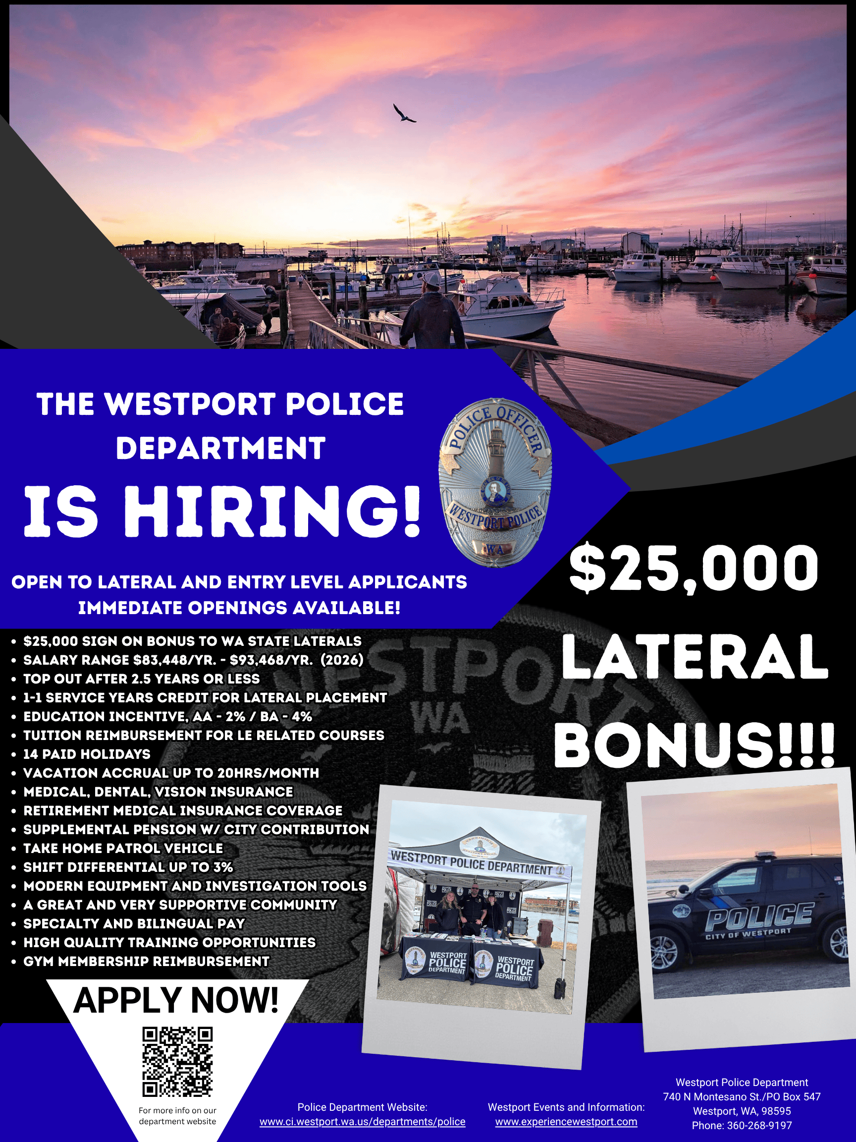The city of Westport (WA) is seeking Washington State certified/eligible lateral Police Officer applicants!